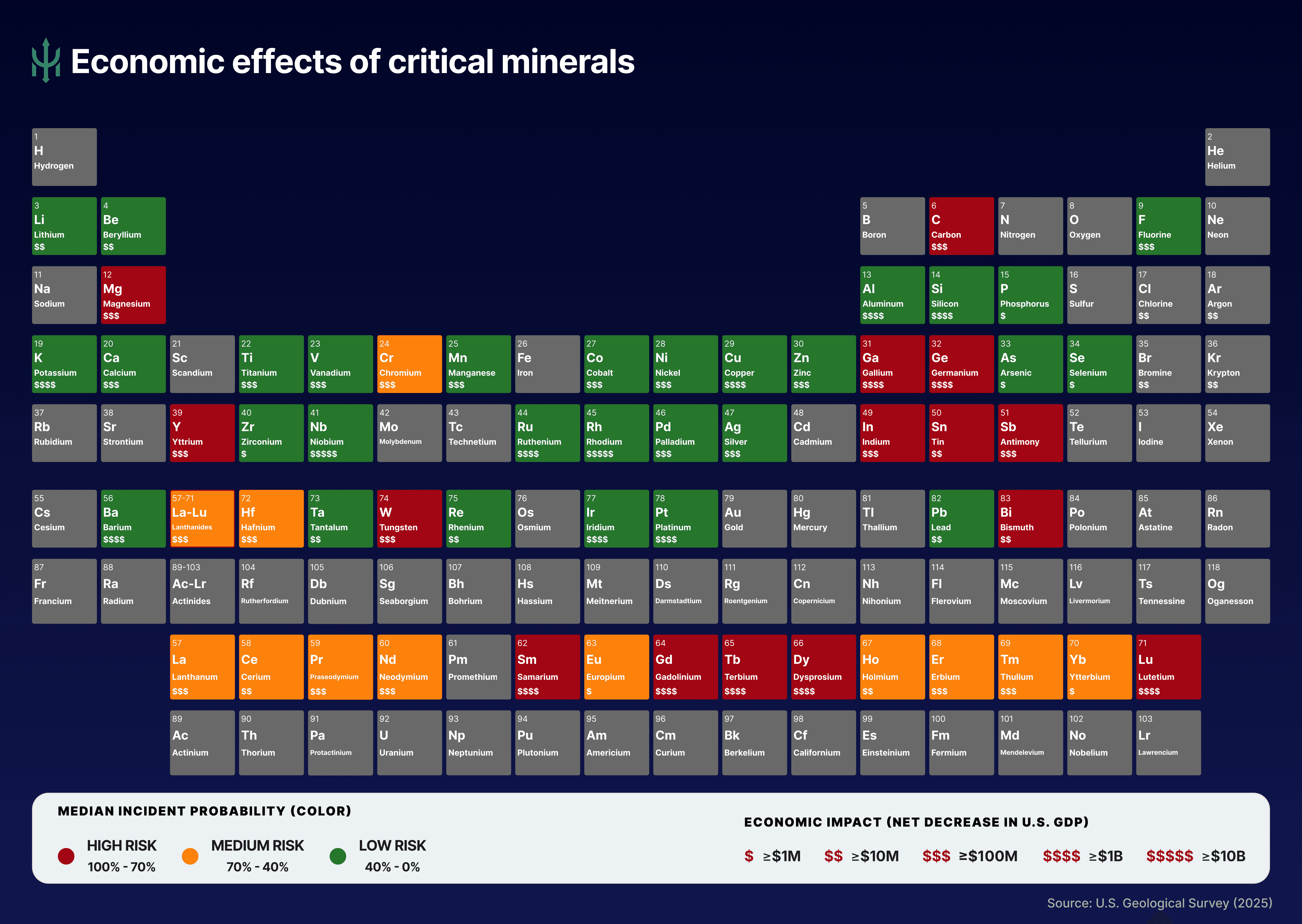 The associated economic risk is not limited to how much of a mineral exists, it also depends on how supply is structured. When production is concentrated, substitutes are limited, and domestic capacity is thin, the entire supply chain becomes fragile. In some cases, there is even a single point of failure by which one disruption can wipe out a large portion of supply.